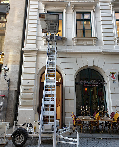 Unser Möbellift ermöglicht die Verbringung von Möbeln auch aus Objekten mit verwinkelten Gängen und engen Treppenhäusern. Wir nutzen dafür die Fenster als Weg nach draußen (oder drinnen). Je nach Abmessungen der Möbelstücke und der Fenster kann dabei sogar auf eine Zerlegung verzichtet werden. Außerdem kann der Möbellift dazu beitragen, lange Laufwege beim Verladen der Möbel und Umzugskartons zu vermeiden, spart somit Arbeitszeit und letztlich auch Geld.